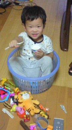 カートに座らせて、かごにいれたおもちゃを